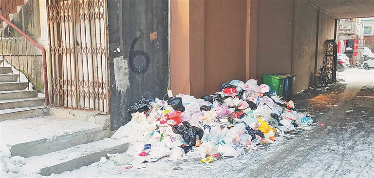 生活报讯 (帮办记者李威兵 文/摄) 11日,哈市市民通过本报热线反映,道里区建国街268号楼下大门洞,最近总是堆满生活垃圾,有时一米多高,堵塞居民通道,影响周边环境。