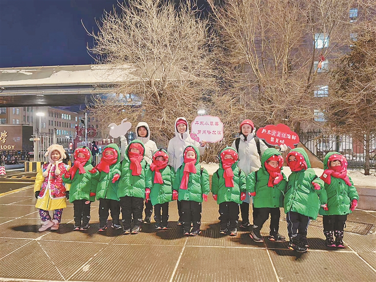 就这样,小朋友们开始了勇闯哈尔滨之旅,当天下午就去了哈尔滨工业大学,参观了校园,品尝了哈工大美食,还把海鲜粥送给了哈工大的大哥哥大姐姐。11日,小朋友们又结伴去了极地馆和冰雪大世界,在这个过程中,孩子们结下了深厚的友谊。“像子涵和天乐,这两个孩子第一天的时候分到了一组参观,那这两天就必须是他们俩一起手牵手,如果排队分到别人了,他俩都不干。”解雅君园长笑着和记者说,丹东小朋友们表现得非常出色,没有一个哭鼻子的,哈尔滨小主人们也是非常热心地照顾小客人。