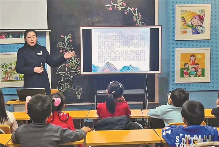 课堂上,老师结合图片、视频,细致介绍斧的由来和历史演变过程。早期的石斧是手握使用的,称为“手斧”,后来则发展为装柄使用,提高了功效。过去一般认为,石斧是用绳绑在木柄上使用的,但是山东、江苏等地出土的象形文字和陶斧、装柄石斧等,却表明石斧的装柄方法有多种。