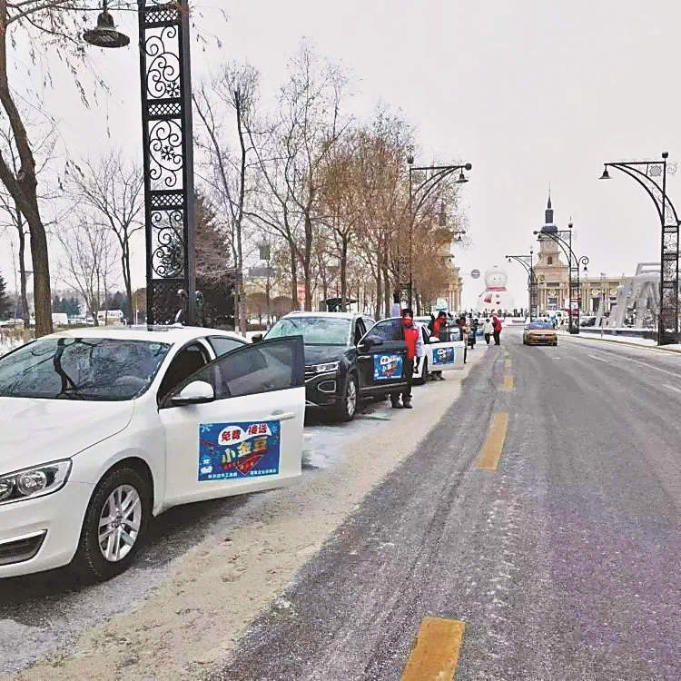 “欢迎你们来哈尔滨旅游,欢迎到香坊吃喝游玩。”1月11日,香坊区的志愿者车队来到道里区友谊西路音乐长廊的“网红大雪人”景点,向南方游客宣传香坊创意街区、伏尔加庄园、黛秀湖公园等旅游景点,邀请他们到香坊区打卡观光。