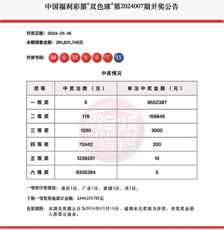1月16日晚,中国福利彩票双色球游戏第2024007期开奖,本期双色球开奖号码为:4、5、6、7、20、22、15。一等奖中出5注,单注奖金为955万余元。二等奖中出178注,单注奖金为15万余元。六等奖中出930万余注。