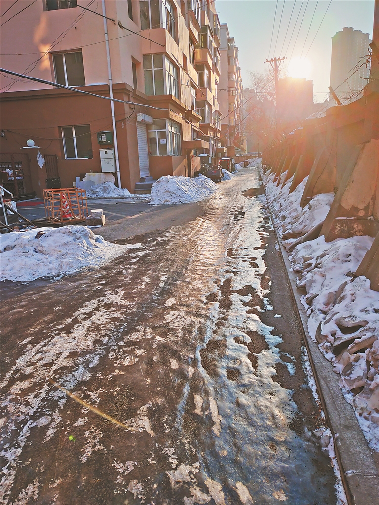 生活报讯 (记者李威兵 文/摄) 18日,哈市市民刘先生通过本报热线反映,道里区河洲街58号门前路段一直没清雪,现在路面上全是冰,这个冬天刘先生已经因为路滑摔了两次,反映了挺长时间,到现在雪还是没清。当日,记者向道里区城管局了解情况,城管局工作人员表示,已经约谈了负责单位,责令其立即清理。