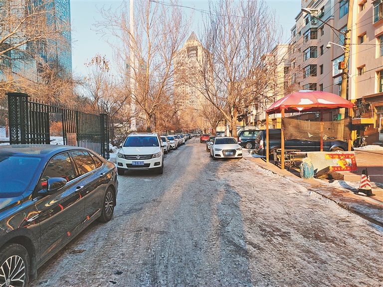 在河洲街58号西侧,路面上的雪几乎没清,因为此处过往的行人和车辆相对较少,路面上的雪还能看出白色。但在路面上车辆通行较多的位置,雪已经被压成了黑色的冰,一条一条的很滑。刘先生说:“我就是在这边雪上滑倒摔一次,在那边的冰上摔一次,两边都摔全了。每次摔完了我都反映,但一直也没人清。”