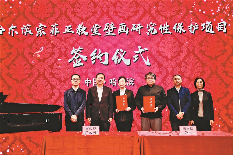 签约仪式上,马迭尔文旅投资集团党委书记、董事长孔庆滨表示,马迭尔文旅投资集团是哈尔滨市整合全市国有文旅资源重组成立的大型国有文旅企业集团,作为全市文旅产业发展投融资平台和战略合作平台,拥有“马迭尔”“冰雪大世界”“太阳岛风景区”“亚布力”“索菲亚”“太阳岛雪博会”“哈尔滨国际马拉松”“哈尔滨冰灯艺术游园会”“中国哈尔滨国际啤酒节”“中国企业家太阳岛年会”等哈尔滨知名文旅品牌,每年接待来自海内外的游客超千万人次。索菲亚教堂作为哈尔滨市的标志性建筑,历经百余年历史变迁,教堂内壁画出现大面积脱落、空鼓、酥碱、烟熏、水渍等病害,严重威胁着壁画的保存,也影响参观效果。