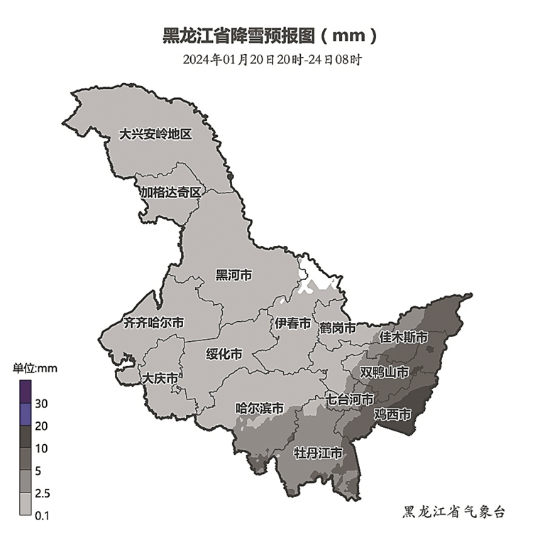 21日:伊春南部、绥化东部、大庆东部、哈尔滨、鹤岗、佳木斯、双鸭山、七台河、鸡西、牡丹江有小雪,其中鸡西东部、牡丹江东部局地有中雪。