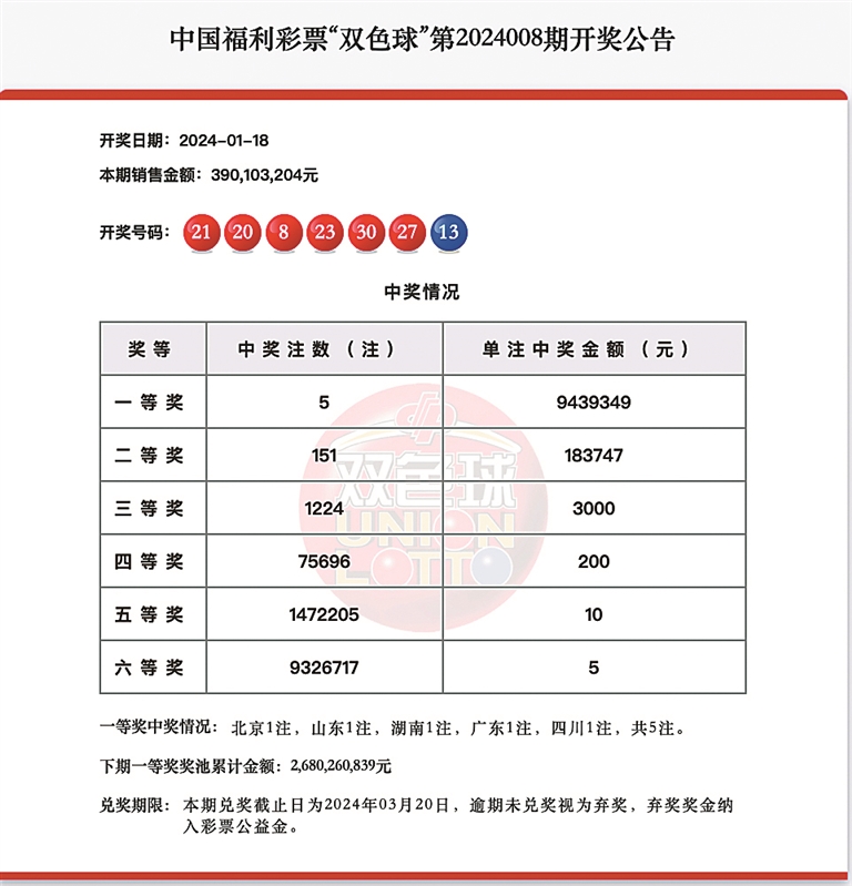 1月18日晚,中国福利彩票双色球游戏第2024008期开奖,本期双色球开奖号码为8、20、21、23、27、30、13。一等奖中出5注,单注奖金为943万余元;中奖情况:北京1注、山东1注、湖南1注、广东1注、四川1注。二等奖中出151注,单注奖金为18万余元。六等奖中出932万余注。