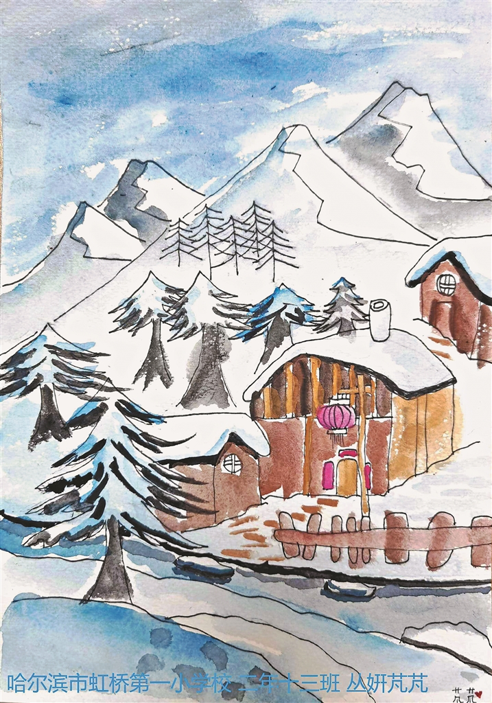 我的作品《雪乡·过年了》,冬天白雪皑皑,大红灯笼已挂好,门上对联也要换新,雪屋、树林、小河描绘出祥和的迎春景象。