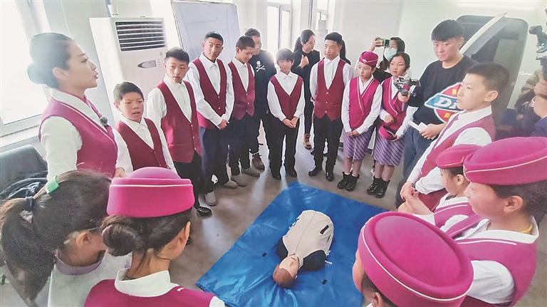 据带队老师介绍,这次研学体验目的是让孩子们近距离接触民航知识、领略飞行魅力。南航黑龙江分公司客舱部进行了精心策划,不仅准备了丰富的航空食品和南航文创礼品,还专门定制了满满的课程:学习航空知识、开展礼仪培训、认识机上应急设备、模拟空中医疗处置等。现场,“编外”小乘务员们在学习过程中全神贯注、热情参与,满载而归。