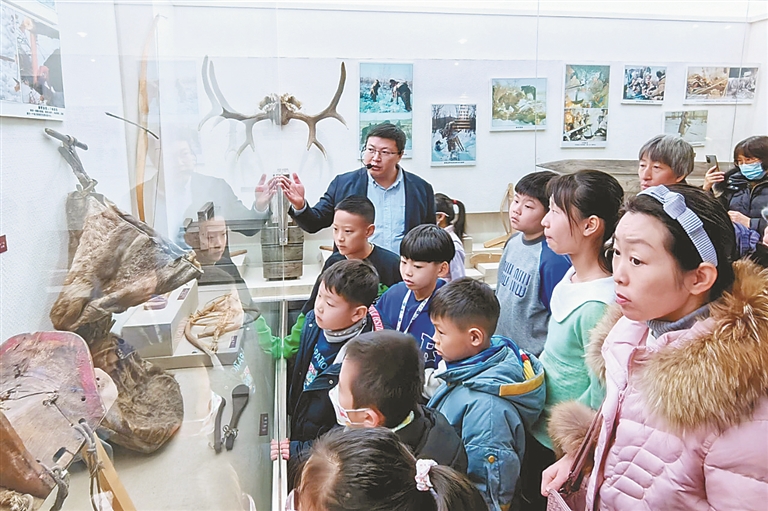 黑大旅游学院于学斌教授讲述了鄂伦春族、赫哲族非遗文化艺术形式的历史渊源,以及民族文化的演变历程。表演环节结束后,大家走进黑龙江大学馆藏文物展,感受民族文化的丰富内涵。东北野牛化石、披毛犀化石铜升龙、玛瑙石镞黑水靺鞨罐、金代铁器狍头帽、鱼皮衣、桦皮船等文物琳琅满目,生动再现了黑龙江流域的民族风情和民俗文化。