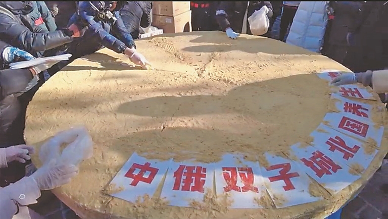 生活报讯 (记者郭登攀) 为了让来自全国各地的游客品尝一下黑河美食,24日,一个直径2.5米的俄式提拉米苏亮相中央大街,瞬间就被“小金豆们”团团围住。鲜香的奶油、香甜的蜂蜜、松软的蛋糕,让“小金豆们”在零下20多摄氏度的天气里大快朵颐起来。