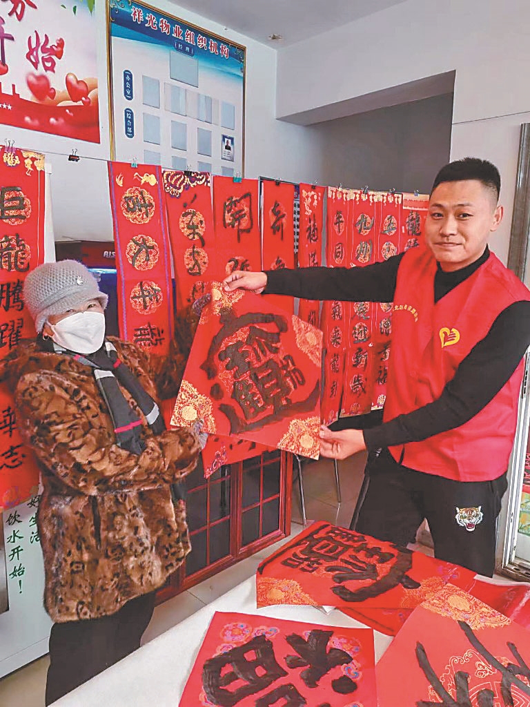 “这个春联是我自己选的,上面的墨都还没干,这种现场写的春联在外面可买不到。”业主李大娘笑着说。拿到春联后,她就小心翼翼地等着晾干,“很开心,物业和社区组织的这个活动,给业主办了件好事,真是字字妙笔,年味渐浓啊!”