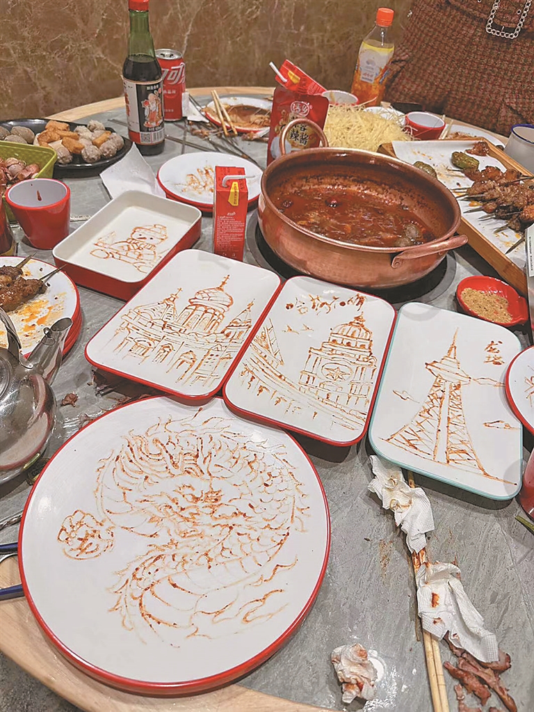 “这次的创作其实是一次偶然。”讲起自己创作的初衷,孙闻硕笑着说:“我的老家是佳木斯富锦,哈尔滨最近特别火爆,我和朋友们就非常想来哈尔滨旅游。”就这样,孙闻硕和朋友们来哈尔滨进行了一次短途旅游。在游览完冰雪大世界、索菲亚教堂、中央大街、哈药六厂等著名景点后,孙闻硕和朋友们来到餐厅休息吃饭,在吃饭的时候,孙闻硕画下那幅画。“朋友们都喝酒,我平时也不喝,吃得就比他们快,看到桌上有腐乳就想着画幅画吧。”孙闻硕说,那时候他正在做“挑战用100种方式画画”的系列作品,看见桌上现成的材料,回想起白天看见的美丽景色,没忍住便随手在盘子上画了出来。