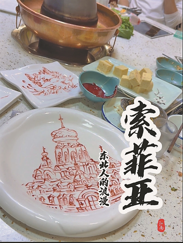 一块腐乳、一根筷子、一个盘子,一双巧手挥舞片刻,一幅细节完整、精致逼真的索菲亚教堂画作便呈现在盘子之中。近日,“东北大哥筷子蘸腐乳画索菲亚教堂”的视频冲上了各大社交平台的热搜,短短几天,该视频就在短视频网站上收获600多万的播放量,近12万的点赞。而这位被网友们亲切地称呼为“腐乳仙人”的画手,就是1994年出生在佳木斯富锦的画师孙闻硕,这条他随手创作的视频引起网友关注后,他又再次利用家乡的美食绘制家乡的美景。近日,记者采访了他。