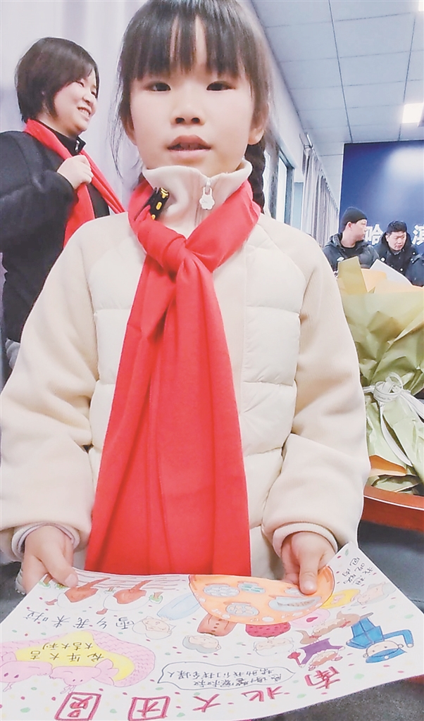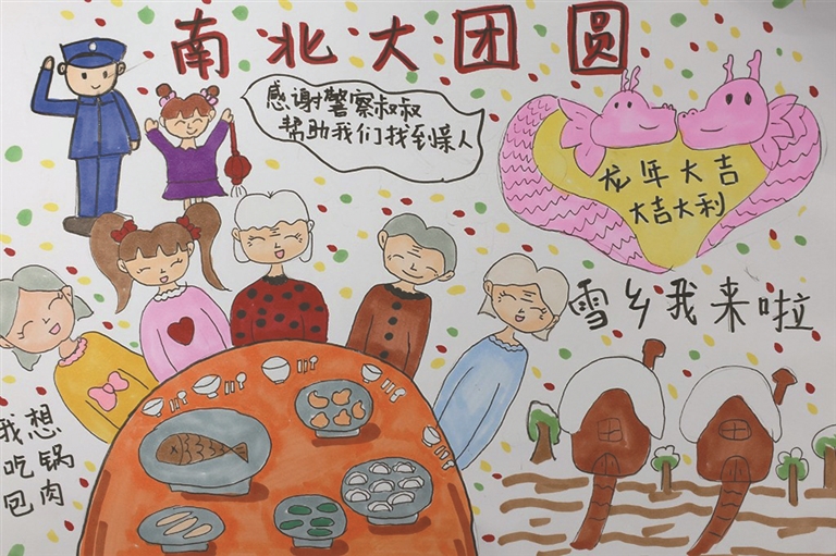 记者了解到,魏女士姐姐的孙女还绘制了一幅画,起名叫“南北大团圆”。这位7岁的小朋友说,画上有她最期待的一家人坐在圆桌前吃饭的画面,还有她想吃的锅包肉、想去游玩的雪乡,更有对警察叔叔的感谢之情。