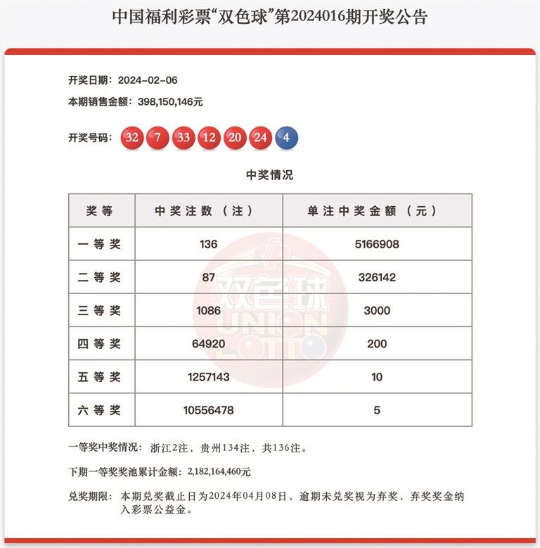 6日,中国福利彩票双色球游戏第2024016期开奖,本期开奖号码为:“7 12 20 24 32 33+4”。本期一等奖井喷136注,单注奖金516万余元,浙江2注,贵州134注;二等奖中出87注,单注奖金32万余元;六等奖中出1055万余注。