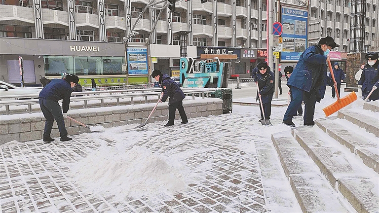 生活报讯 (记者李丹) 2月29日,哈市迎来降雪,3月1日清晨,各区城管执法部门出动573名执法队员,为全市105所中小学校周边清理积雪。并采取定人、定点、定时进行巡视执法检查,对各类违法违规行为进行有效管控。