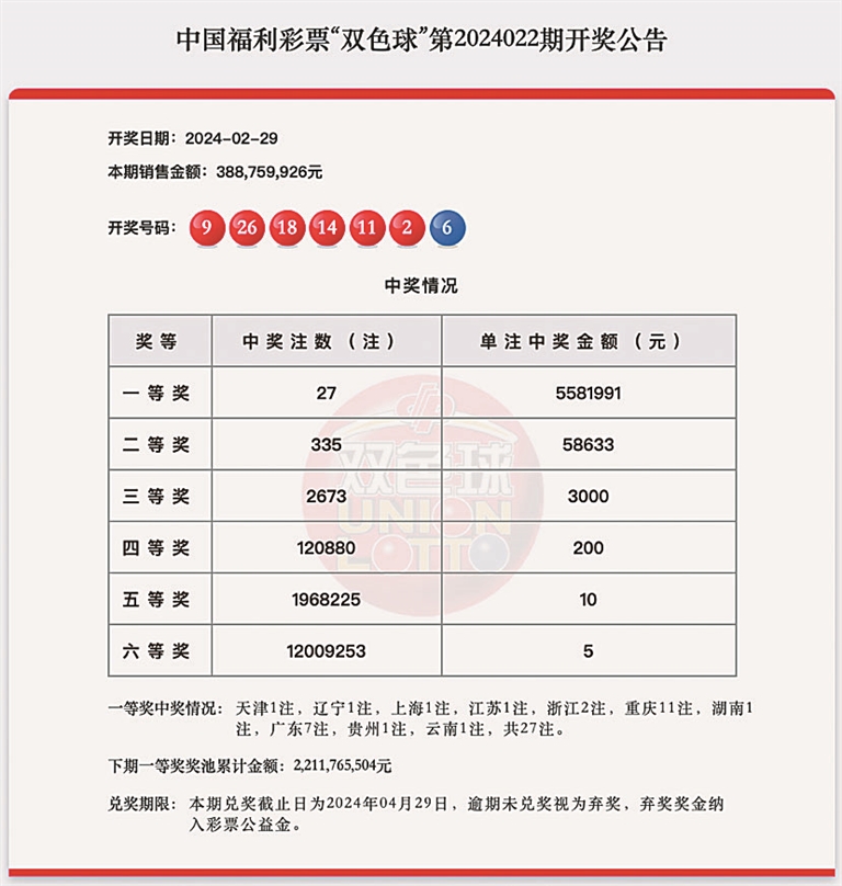 2月29日晚,中国福利彩票双色球游戏第2024022期开奖。本期双色球开奖号码为2 9 11 14 18 26 6。一等奖中出27注,单注奖金为558万余元,中奖情况:天津1注,辽宁1注,上海1注,江苏1注,浙江2注,重庆11注,湖南1注,广东7注,贵州1注,云南1注;二等奖中出335注,单注奖金为5万余元;六等奖中出1200万余注。本期销量3.88亿余元,筹集公益金1.39亿余元。下期一等奖奖池累计金额22.11亿余元。据中国福彩微信公众号