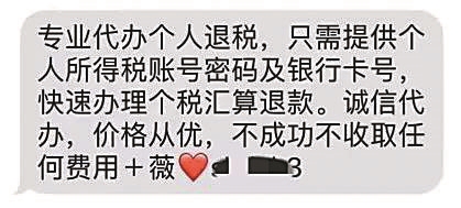 骗子会通过电话或者短信:“只要提供个税App账号密码和银行卡号,我们就可以帮忙操作办理个税汇算退税,按退税到账金额比例支付服务费,若没有成功不收取费用!”