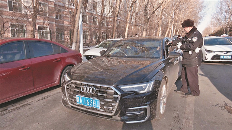 16时30分许,交警哈西大队在学府东四道街开展巡查过程中发现,黑A1638*号车辆双排违停在道路右侧的停车泊位旁,而驾驶人却在车内玩着手机,交警立即上前对其进行取缔。