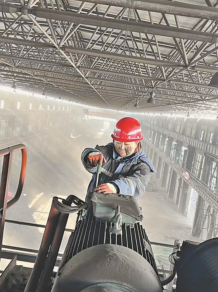 刘丹丹登上十多米高的天车维修电机