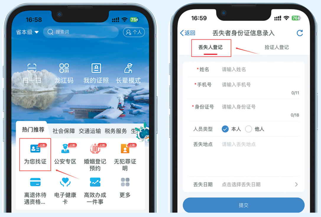 打开黑龙江全省事APP,在首页找到“为您找证”,点击进入。在页面上方选择“拾证人登记”,填写拾到身份证的姓名及身份证号、拾证人手机号、拾证详细地址,并选择拾证市级后点击“提交”即可。