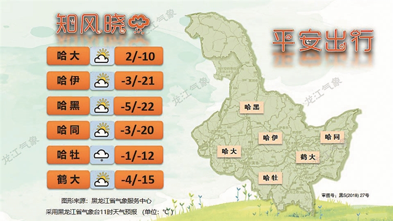 10日夜间至11日白天:全市多云转晴;西南风转西北风1~3级;最低气温木兰、通河、依兰-11~-8℃,其他区域-7~-6℃,最高气温依兰1~2℃,其他区域3~7℃。