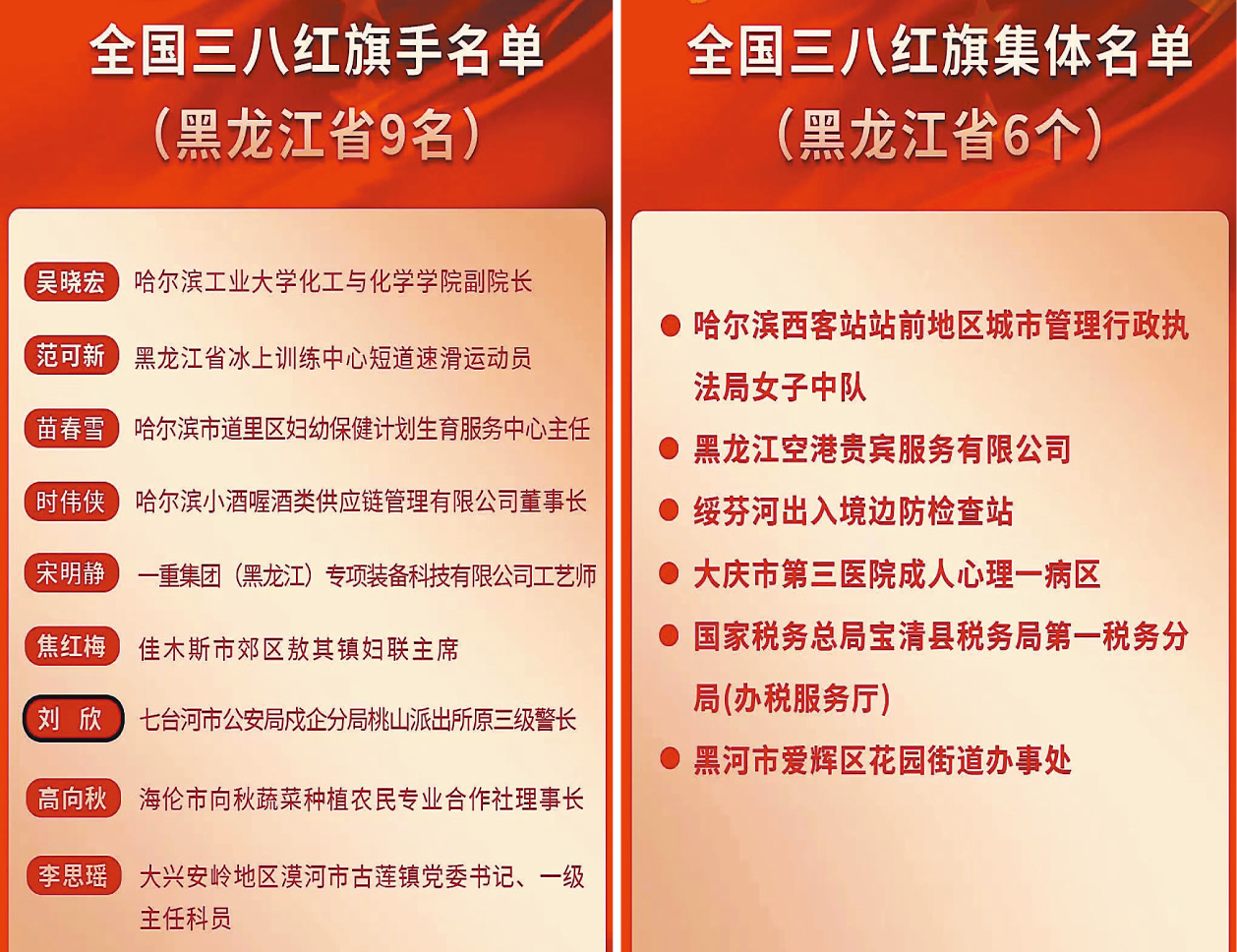 生活报讯 (记者刘维娜 李丹) 3月8日,生活报记者从省妇联获悉,为表彰先进、树立典型,进一步引领激励广大妇女跟党奋进新征程、巾帼建功新时代,全国妇联决定,授予黄会林等10人全国三八红旗手标兵称号,授予王殊等300人全国三八红旗手称号,授予清华大学附属小学等200个单位全国三八红旗集体称号。其中,黑龙江省有9人获得全国三八红旗手称号,6个集体获得全国三八红旗集体称号。