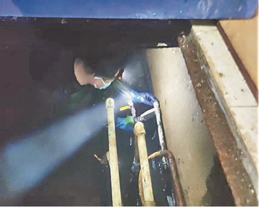 水暖工李广文穿好水衩进入地下室,由于该处已有20余年无人使用,室内的排水管线已经损坏,无法排除积水,下水管线也损毁多年,导致地下室内气味恶臭。李广文屏住呼吸坚持进行维修,为保证自身安全,他每隔两三分钟就需要爬上来透气。历经一个多小时的艰难维修,他终于成功更换该处热熔阀门,控制住了漏水。