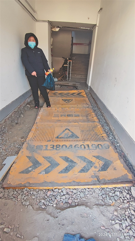 居民们表示,遗留的大坑都在楼道里,尤其在3号楼比较集中。在居民的带领下,记者走访了3号楼4单元至9单元,发现所有的单元门都大敞四开,过道也没完工。记者在5单元看到,楼内过道的路面被破开,铺了一层号石,没有抹水泥,上面还有一块铁皮围挡,在旁边留了一条约半米宽的水磨石地面,供居民上楼使用。其他单元也是同样的情况,有的围挡下面还没来得及填实,能看到大坑;有的单元连过道都没留,居民只能踩着铁皮和木板进出。9单元居民表示,他们找过施工单位,但对方只说建完就好了。