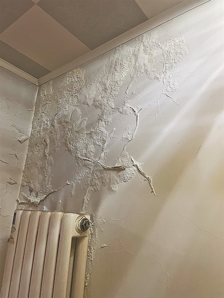 “二月份发现漏水的时候打物业电话,来了一个师傅,但师傅说整不了,打旧改电话也没人接,现在屋里电线渗水,插座、卫生间灯用不了,客厅灯也坏了……”7栋10单元603室的臧先生说道。记者来到臧先生家中发现,北向卧室天棚大面积墙皮脱落,有的墙皮被泡得发黄。“我家上面还有一层,这水是顺着墙缝流下来的,楼上肯定更严重。”