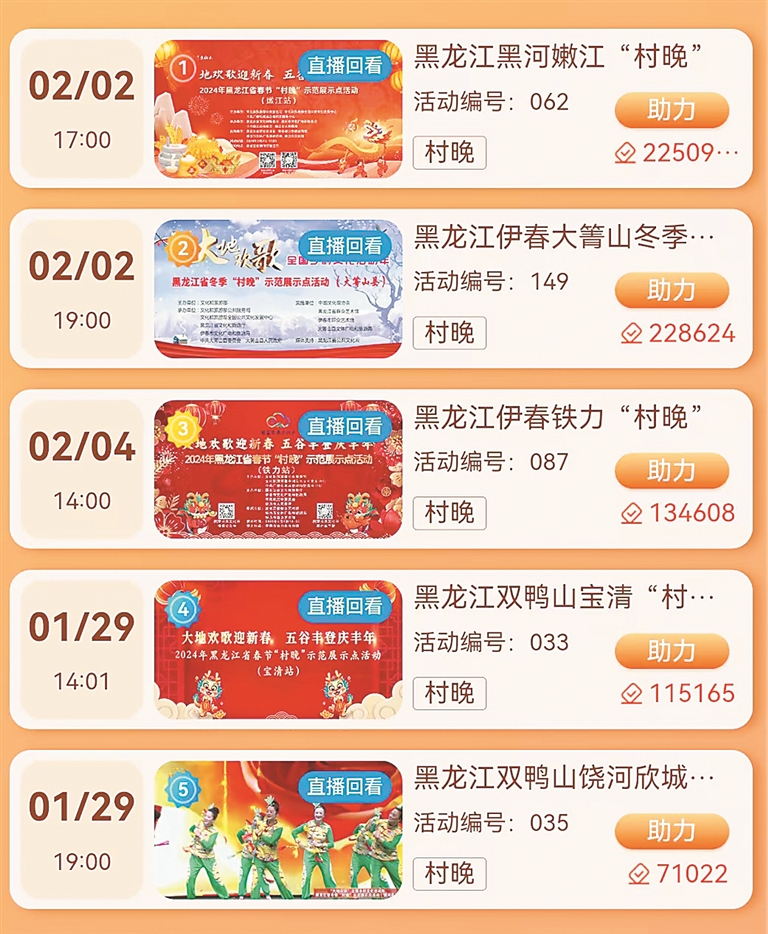 生活报讯 (记者吴海鸥 王晓晨) 记者近日获悉,由文化和旅游部公共服务司等主办,黑龙江省文化和旅游厅承办,黑龙江省群众艺术馆、有关地市联合实施的黑龙江春节“村晚”示范展示点活动,日前分别在嫩江市、宝清县、铁力市精彩上演。在随后进行的全国投票评选中,黑河嫩江“村晚”位列榜首,我省5场“村晚”均进入榜单前30名。