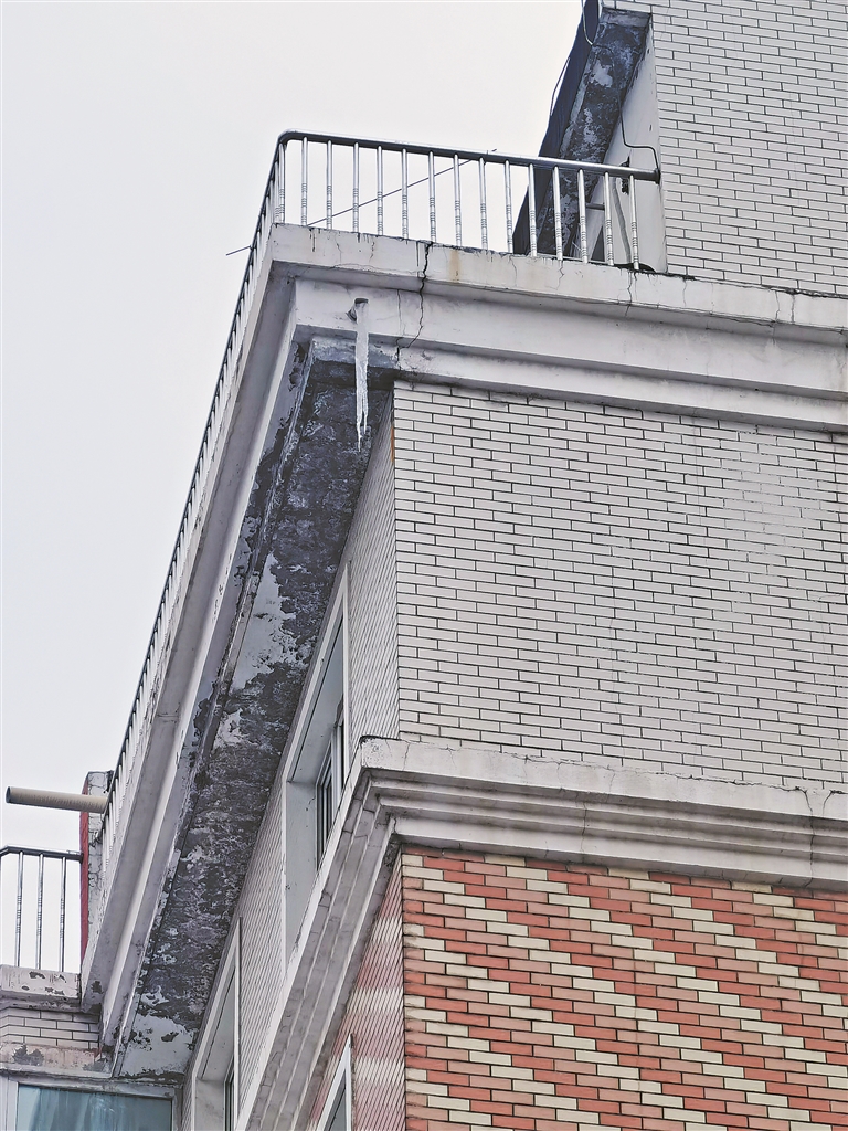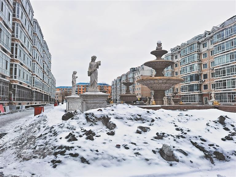18日,记者来到道外区药六嘉园。进入大门记者看到,广场上矗立着多个欧式雕塑,但雕塑下和广场里的积雪与美丽的景致形成极大反差,广场两侧是两条通往居民楼的甬道,路面上布满了积雪。走访中记者发现,小区很多单元门前的积雪融化后冻成一层薄冰,行走在湿滑的地面上非常困难。个别居民楼上已经形成冰溜子,在小区2号楼,一根长约80厘米的冰溜子悬挂在屋檐上,看起来十分危险。