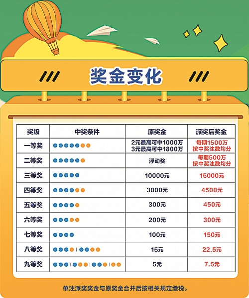 此次派奖,一等奖派奖3亿元,每期1500万元;二等奖派奖1亿元,每期500万元;固定奖(三至九等奖)派奖6亿元,派奖奖金为当期对应奖级单注奖金的50%,6亿元派完为止,结束当期派奖奖金不足部分由超级大乐透调节基金补足。