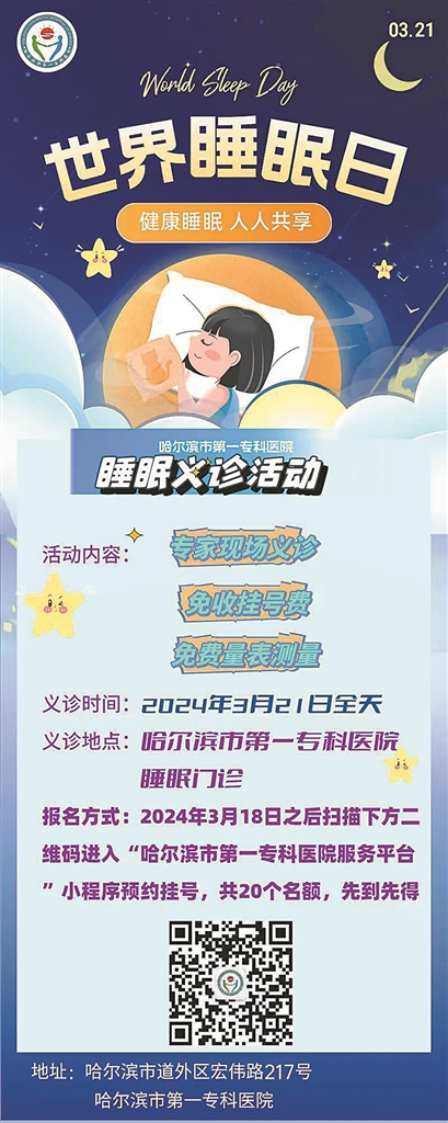 为提高市民的睡眠质量,加强对睡眠质量的关注,哈尔滨市第一专科医院特开展大型义诊活动。活动目的: