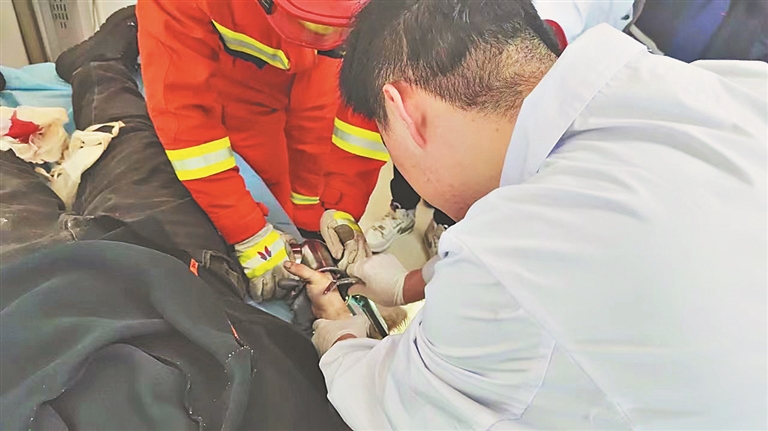 友协大街站指战员对绞肉馅机构造进行了解后,立即利用无齿锯进行切割作业,将绞肉馅机外隔板摘下。但由于绞肉馅机内部构造较为复杂,无法确定男子手部被卡具体位置,为避免发生二次伤害,友协大街站指战员建议家属立即将男子送至医院进一步处置。随后家属联系哈尔滨长征医院并前往处置,友协大街站指战员随同前往。到达医院后经医生诊断,男子右手3、4、5手指已无法正常使用,在医生对男子手臂进行局部麻醉处理后,友协大街站指战员进行进一步处置,成功将男子右手大拇指、食指脱出。