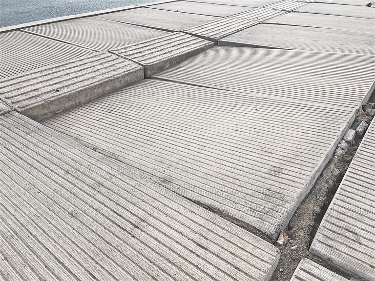 20日9时许,记者到达刘女士所反映的霁虹桥区域,一大块灰色的人行步道板一角下沉,行人需谨慎绕行,“前几天还没有呢,希望有关部门尽快处理。”刘女士说道。