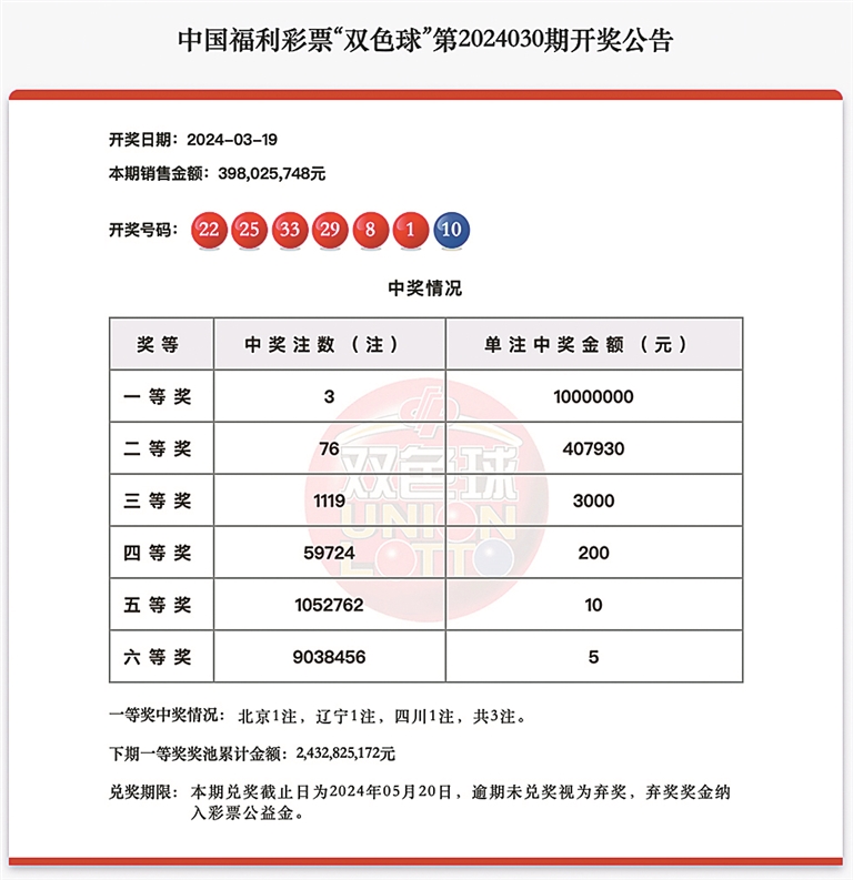 一等奖中出3注,单注奖金为1000万元,中奖情况:北京1注,辽宁1注,四川1注。二等奖中出76注,单注奖金为40万余元。六等奖中出903万余注。本期销量3.98亿余元,筹集公益金1.43亿余元,下期一等奖奖池累计金额24.32亿余元。