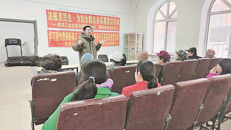 生活报讯 (记者李丹 文/摄) 20日,哈市香坊区建筑街道电机新村社区携手黑龙江慈善总会、黑龙江省企业法律顾问协会、哈尔滨市香坊区慈善总会,开展了法援惠民生·为妇女群众办实事宣讲活动。
