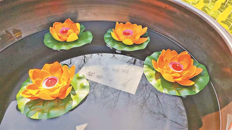 据了解,今年清明前夕,经过认真调研分析,皇山公墓确定引入与海葬环保理念高度契合的“水溶祭祀”方式,为海葬逝者家属提供更具仪式感的祭奠新载体。“水溶祭祀池”设置在海葬纪念碑旁,池中的信笺、千纸鹤、纸船等均用水溶纸制成,这种水溶纸由植物合成的木浆制作而成,入水即溶,安全无污染。家属可以将对逝亲的思念写在水溶纸上,并亲手放入祭祀池中。“水溶相思,你我相连,纸上诉情,清明祈愿。”一封封饱含深情的家书在池水中渐渐散去,泼墨抒哀思。另外,祭祀池中辅之以荷花烛光,海葬纪念碑周围黄色风车轮转,寓意“海魂-生命永恒”主题。