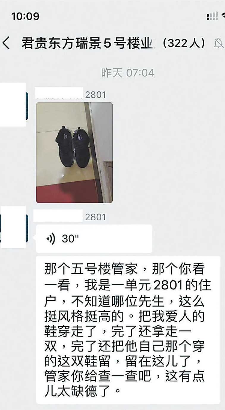 陈先生的妻子王女士知道后,于当日7时许在业主群内联系物业管家,“五号楼管家,你看一看,我是一单元2801的住户,不知道哪位先生,把我爱人的鞋穿走了,还拿走一双,完了还把自己穿的鞋留在这儿了,管家你给查一查吧。”