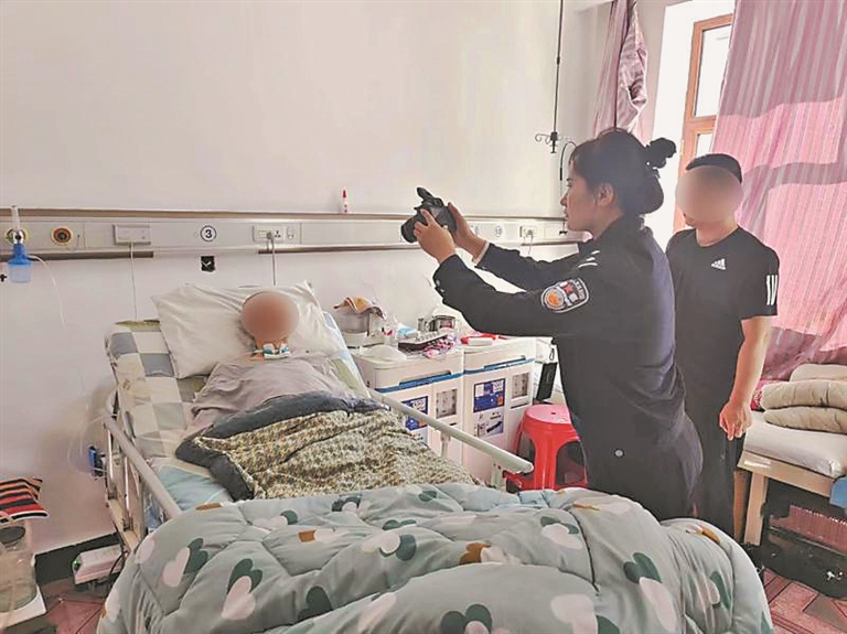 了解情况后,民警第一时间携带设备前往医院,为梁先生的父亲进行身份信息采集。然而,此项任务并非易事,因病痛折磨,梁老先生的肢体无法自控地颤动不已。为了能准确捕捉到身份信息,民警一次又一次地调整姿态,尝试在不同角度下拍摄照片。经过多次调整姿态拍摄,终于采集到了一张合格的人像图片。