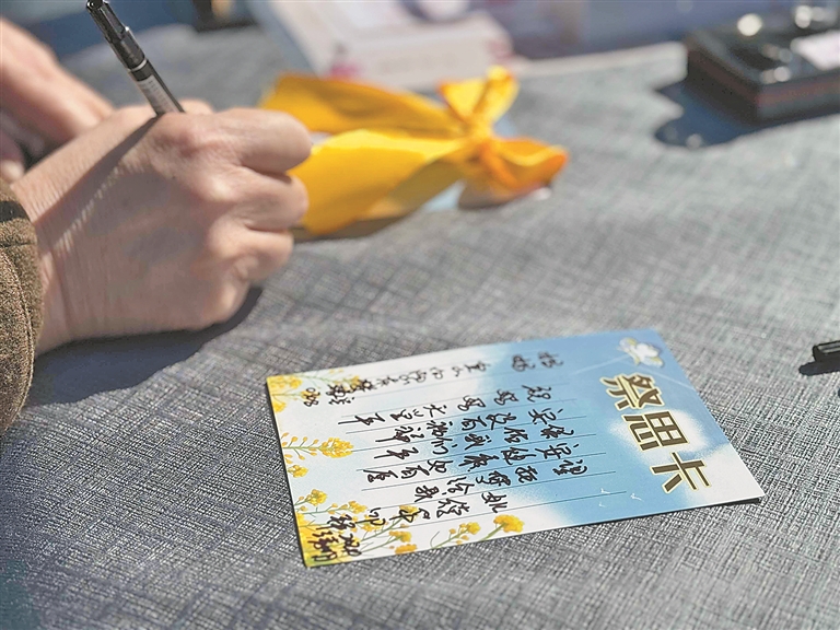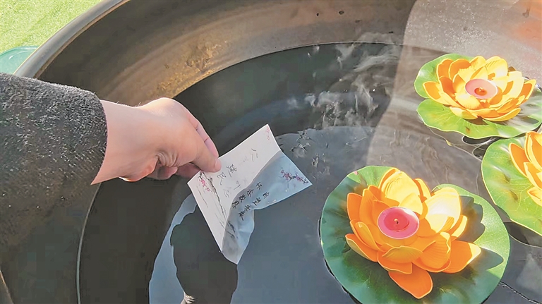在皇山公墓天外天广场的海葬纪念碑前,水溶祭祀正式亮相。曾在2021年参加过第二十八次海葬的市民张女士和弟弟特意赶来,“这几年政府大力倡导环保祭祀,对于一些创新的方式、替代的方式还是非常期待的。昨天看到媒体宣传,今天一早特地赶来。水溶纸我们第一次见,觉得挺好的,它入水即溶,过一会儿就消失不见了,代表思念托流水捎去……”张女士还说,这种新祭祀方式简约便捷,本想去大连海上祭奠,但因工作忙碌无法出行,这一新方式终于弥补了自己的遗憾。