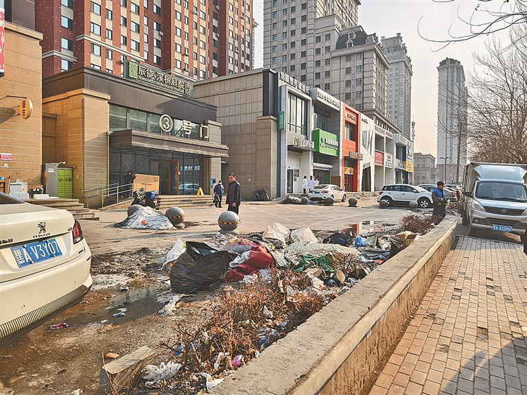 记者在现场看到,辰能溪树庭院3号门前的停车区邻近人行道的部分,生活垃圾、杂物堆积在一起,形成的垃圾带长度近十米。“有时候是附近商家随便扔的,后来堆积了杂物,实在有点太脏了。”