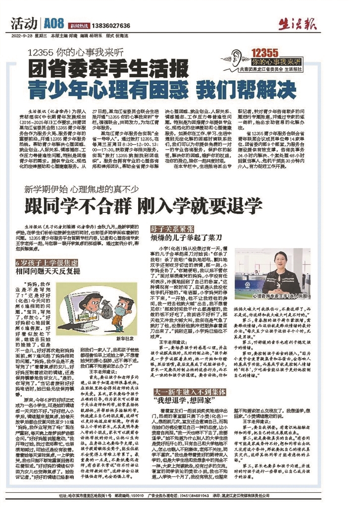 据悉,2022年9月,为深入贯彻落实《中长期青年发展规划(2016-2025年)》工作要求,共青团黑龙江省委员会把12355青少年服务台作为服务大局、服务青少年的重要前沿,开通12355青少年服务热线。帮助青少年解决心理困惑、就业创业、人际关系、情感婚恋、工作压力等普遍性问题,特别是困难青少年的需求。提供专业化、规范化的法律援助和心理健康服务。同年9月,黑龙江省委员会联合生活报开通“12355 你的心事我来听”专栏,强强联合,共同发力,为龙江青少年服务。