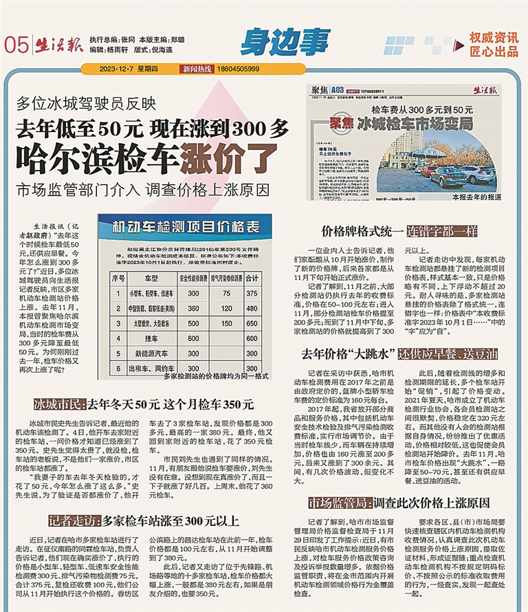 哈尔滨市区机动车检测价格下降,双城区部分检测站的价格也略有调整。记者从双城鹏达、北城等机动车检测站了解到,目前他们的检测价格是150元。