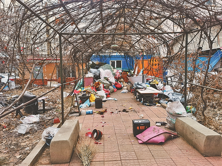 当日下午,记者在大成小区院内看到,航涵物业大成项目部办公地点位于小区院内,就在办公地点门口附近,是一处长约10多米的拱形葡萄架,葡萄架里面却散落着破碎花盆、扫帚、编织袋、泡沫箱等垃圾杂物。王女士告诉记者,这个葡萄架是业主们自发建成的,每年夏天,葡萄架里绿意盎然,业主们在这里纳凉聊天。如今,这里却成了垃圾堆,和物业反映多次,也没有清理。在小区一栋居民楼的楼下,记者看到,积雪铺在小区的道路上。王女士说,以前,这些雪被物业堆在甬道旁边,前几天,物业的工作人员把雪堆推平了,把积雪随意堆在了甬道上。