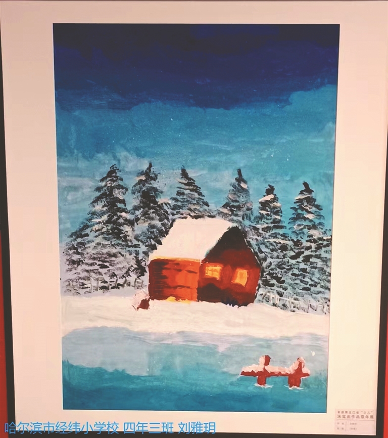 这是我的一幅水粉画《冬日》,这幅画入选首届黑龙江省少儿冰雪画作品双年展,在黑龙江省美术馆展出。