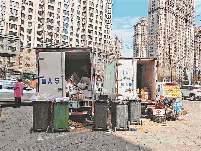 2日中午,记者来到现场看到,全盈生鲜门前的车位里停放了两辆白色箱货,车厢内几乎装满了泡沫箱和塑料箱,几名工人正在车厢内摆放物品。其中一辆车的左侧前后轮胎瘪了,货车周围放着数个垃圾桶和一些没有搬上车的塑料箱。该位置紧邻居民楼,有一定的消防安全隐患。记者从现场工人口中得知,这两辆车都是全盈生鲜的。