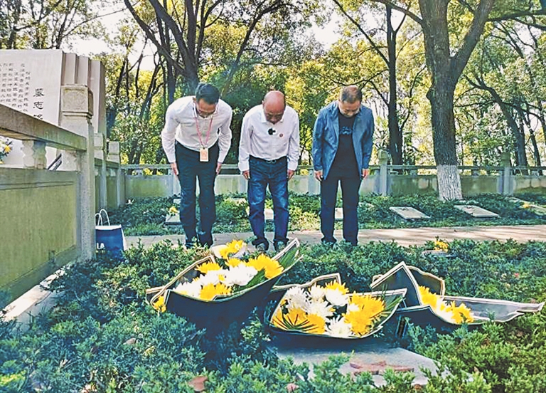 与此同时,千里之外的湖北宜昌革命烈士陵园内,由烈士宗亲苑会文带队的苑氏后人,也在祭拜安葬于此的苑青山烈士。