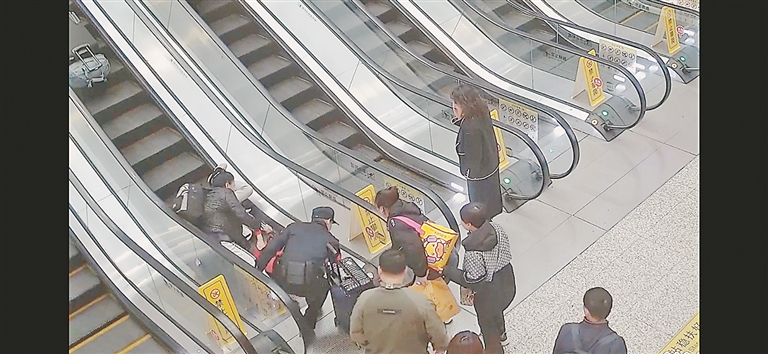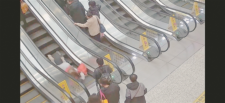 生活报讯 (记者栾德谦) 近日,一位旅客在上行的扶梯上摔倒,哈尔滨铁路公安处民警飞奔上前按下紧急制动按钮,化险为夷。